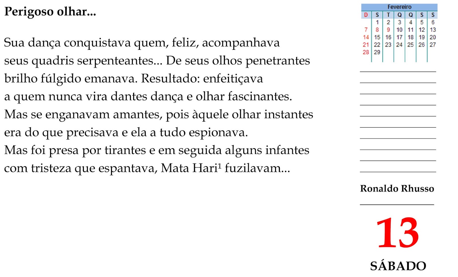 ¹Mata Hari em Malaio ou Língua Indonésia significa “Olho da manhã ou, literalmente, “Sol”.
