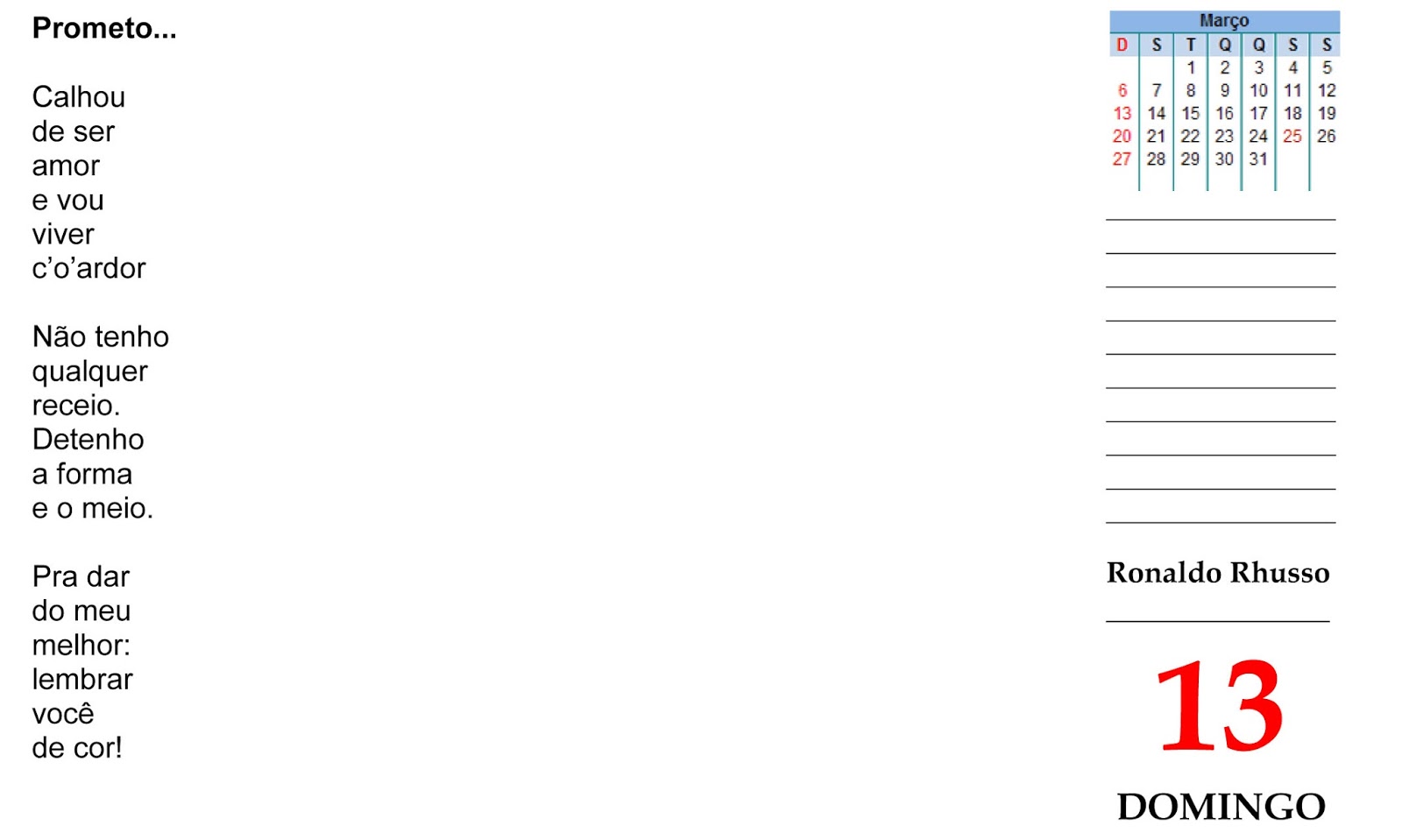 Poema dissílabo ou contendo em cada verso duas sílabas poéticas. Vamos falar um pouco dos pés¹ básicos e compostos que nesse texto predomina o Troqueu ou Coreu. As exceções são “não tenho” (apesar de ter apenas duas sílabas poéticas é formado por um “antibaquio” = duas sílabas longas [não; te] e uma breve [nho]); “receio” formado por um “anfíbraco” = uma sílaba longa [cei] entre duas breves [re; o]; “detenho” outro “anfíbraco”; “a forma” idem; “e o meio” também “anfíbraco”, mas devo frisar a Elisão entre “e-o” meio. Então como pé básico tivemos o “Troqueu” ou “Coreu” e como pés compostos tivemos um “antibaquio” e três “anfíbraco”.
