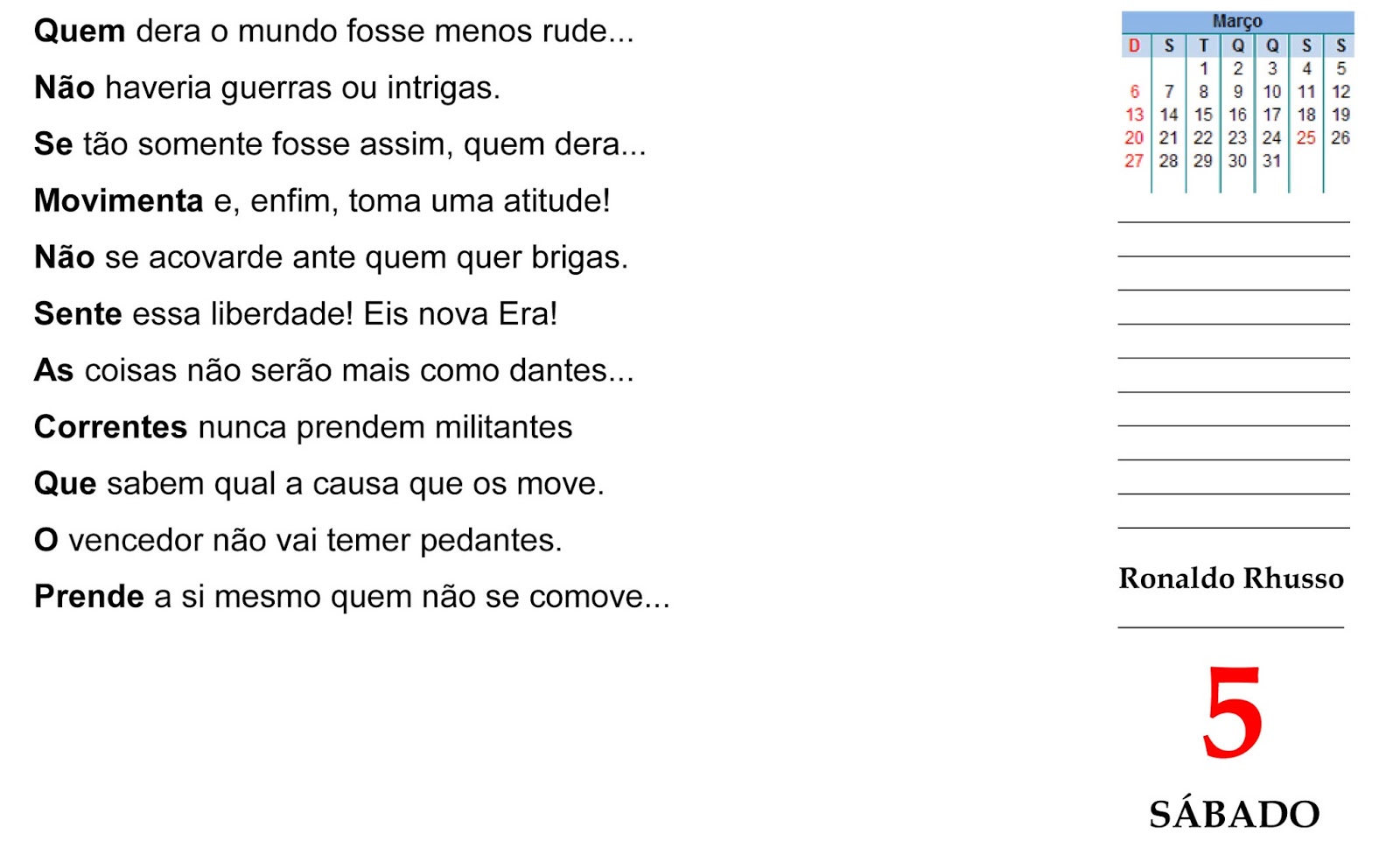 O Texto acima tem por título a frase formada por cada primeira palavra no sentido vertical de cima para baixo: “Quem não se movimenta não sente as correntes que o prende”. Essa frase é atribuída a Rosa Luxemburgo. Os versos são Decassílabos heroicos com quebras propositais de ritmo, comuns em uma Revolução. Esse tipo de texto foi denominado pelo poeta Carlos Fiore como poema subliminar e muito praticado, especialmente pela saudosa poeta gaúcha Denise Severgnini que nos deixou em 8 de janeiro de 2013... Uma pena...