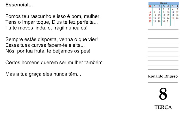 O dia 8 de março é comemorado como Dia Internacional Da Mulher. Há tantas controvérsias acerca do que originou esse dia que prefiro lembra-lo como um dia muito especial que deveria ser lembrado todos os dias, sem exceção, de maneira que todas as injustiças cometidas contra a mulher sejam extirpadas, tais como a violência, desigualdade em relação aos salários, mesmo executando funções similares às de nós homens... Enfim, igualdade é o que deveríamos, com justiça pleitear!