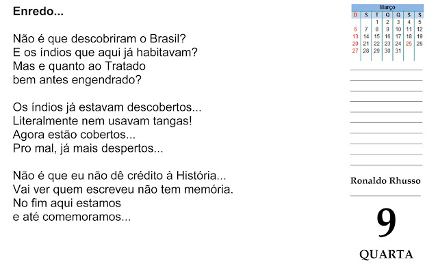 Conforme historiadores foi no dia 9 de março que a Esquadra de Cabral composta por treze caravelas partiu de Portugal para vir “descobrir” o Brasil. Ocorre que em 7 de junho de 1494 o Reino de Portugal e o Reino da Espanha haviam assinado um Tratado, o de Tordesilhas que demarcava a área em que cada Reino poderia explorar. Os territórios a Oeste pertenceriam à Espanha e à Leste pertenceriam a Portugal.