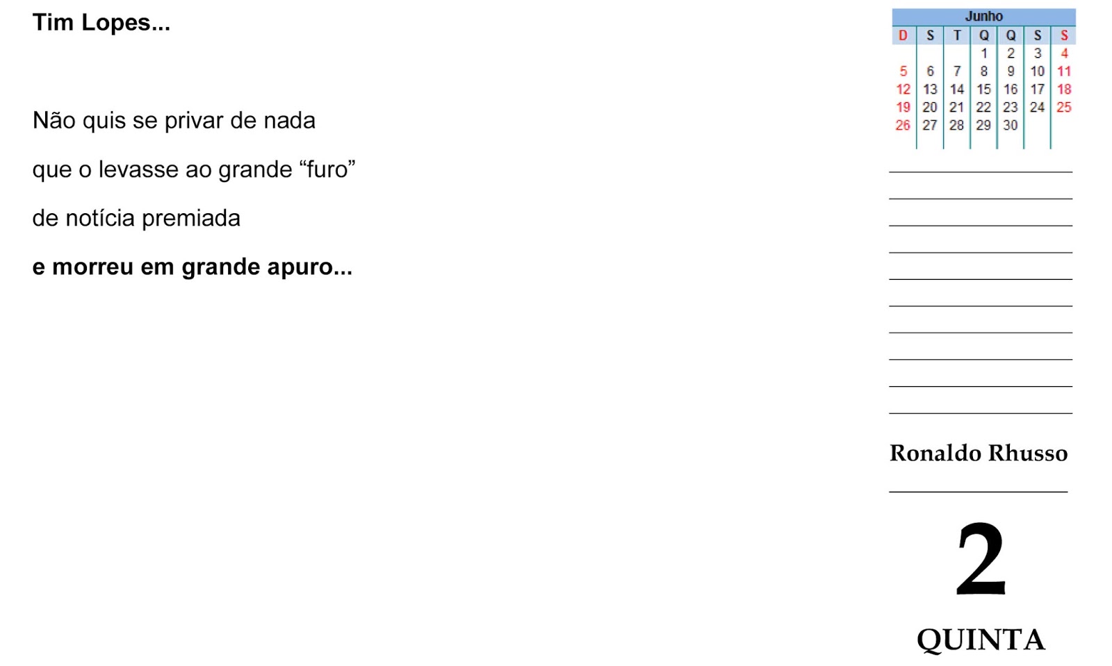 Tim Lopes desapareceu em 2 de junho de 2002. Depoimentos de narcotraficantes presos indicam que ele teria sido sequestrado e morto entre as 22 e 24h daquele dia. Sua morte somente foi confirmada a 5 de julho, após exame de DNA dos fragmentos de ossos encontrados num cemitério clandestino.