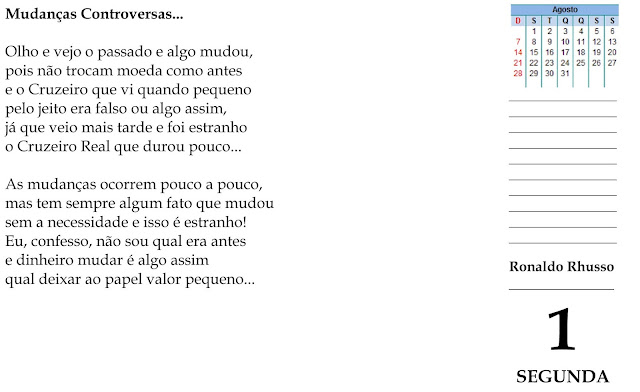 Aos mais jovens devo alertar que já tivemos o Real (1500 a 1942), o Cruzeiro (1942 a 1967), o Cruzeiro Novo (1967 a 1970), o retorno ao Cruzeiro – A Missão (1970 a 1986), o Cruzado (1986 a 1989), o Cruzado Novo (1989 a 1990), o retorno do Cruzeiro – A Saga (1990 a 1993), o Cruzeiro Real – o outro era sonho (1993 a 1994) e o Real (1994 a...).