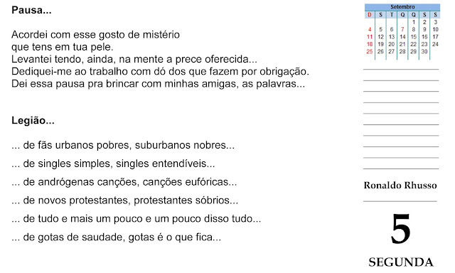 A partir de hoje, ao menos por uns dias, presentear-vos-ei com um poeminha a mais antes de escrever algo relativo ao dia. Procurarei usar Versos Livres nessas composições adicionais.
