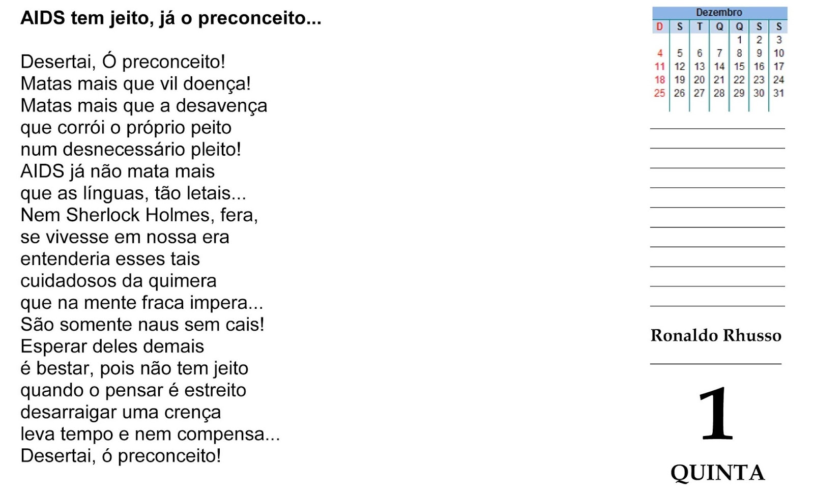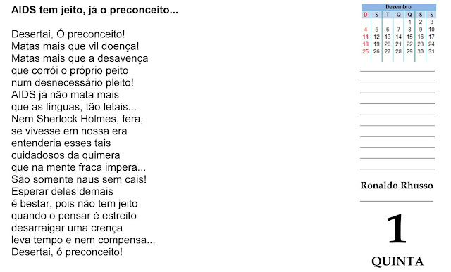 No mundo inteiro é o Dia Mundial de Combate à AIDS ou SIDA...