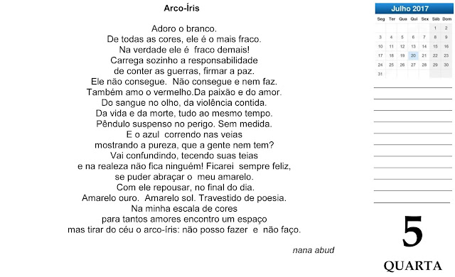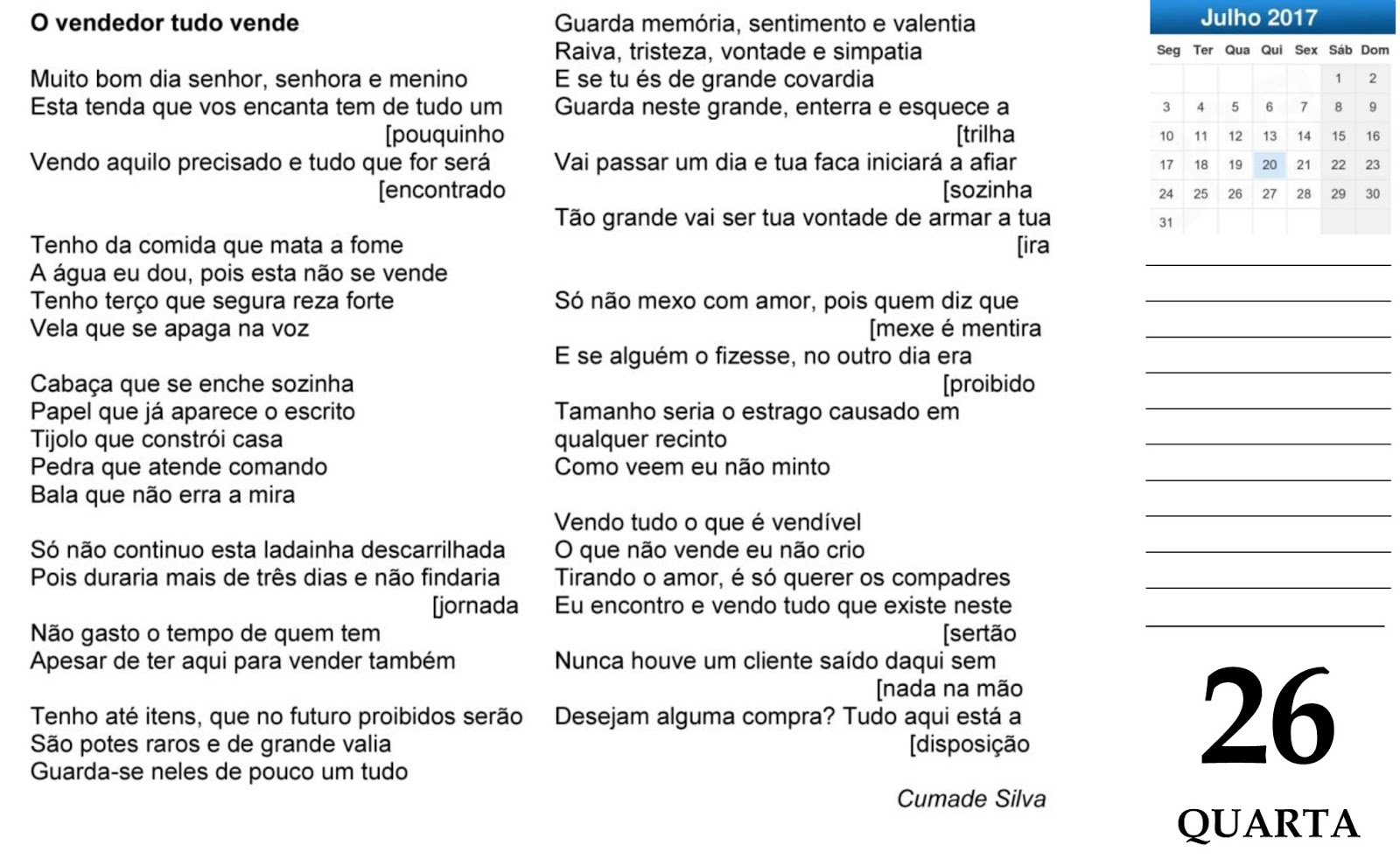 Quem não quer encher a pança / Com os versos de cada dia? / Quem não quer essa alegria? / Quem não quer uma lambança / De boniteza e esperança? / Quem não quer ver a aliança / Do hoje adulto com a criança / Do agora com a fantasia? / Quem não quer mais utopia? / Quem não quer a Poemança? //////////////////////////////////////////////////////////////////////////////////////////////////////////////////////////Folhinha de 2025 (Poetas de Barranco) Em preparação 2029 (Tema "Árvore") e 2030