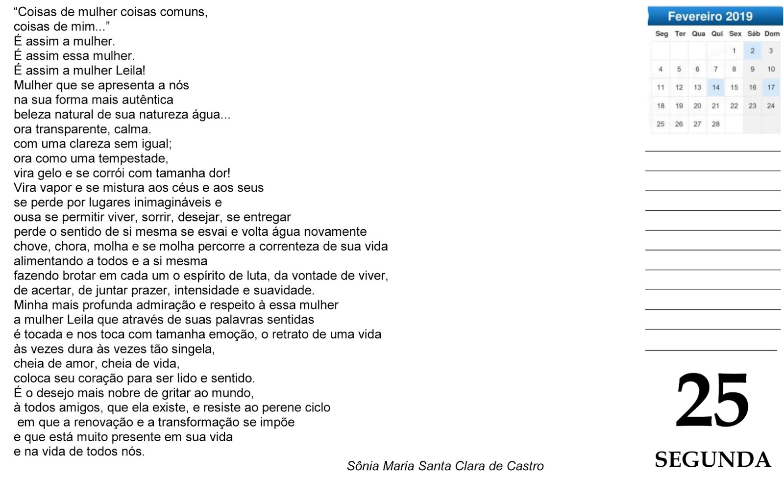 Quem não quer encher a pança / Com os versos de cada dia? / Quem não quer essa alegria? / Quem não quer uma lambança / De boniteza e esperança? / Quem não quer ver a aliança / Do hoje adulto com a criança / Do agora com a fantasia? / Quem não quer mais utopia? / Quem não quer a Poemança? //////////////////////////////////////////////////////////////////////////////////////////////////////////////////////////Folhinha de 2025 (Poetas de Barranco) Em preparação 2029 (Tema "Árvore") e 2030