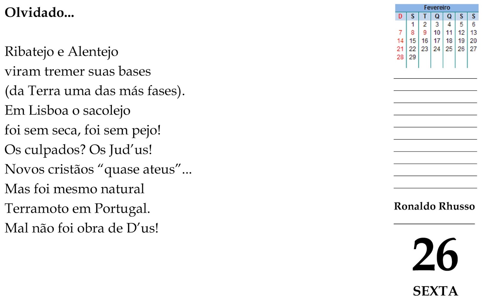 Vale informar ou relembrar que o mês de fevereiro só conta com 29 dias nos chamados “anos bissextos” que ocorrem a cada quatro anos. O ano comum tem, segundo os cientistas, 365 dias e cerca de 6 horas. A cada quatro anos essas 6 horas atingem 24 horas ou um dia, de maneira que o quarto ano passa a ter 366 dias, ou seja, seis duplo no final. Seis duplo = bissexto!