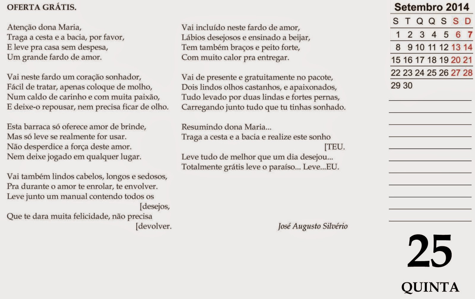 Quem não quer encher a pança / Com os versos de cada dia? / Quem não quer essa alegria? / Quem não quer uma lambança / De boniteza e esperança? / Quem não quer ver a aliança / Do hoje adulto com a criança / Do agora com a fantasia? / Quem não quer mais utopia? / Quem não quer a Poemança? //////////////////////////////////////////////////////////////////////////////////////////////////////////////////////////Folhinha de 2025 (Poetas de Barranco) Em preparação 2029 (Tema "Árvore") e 2030