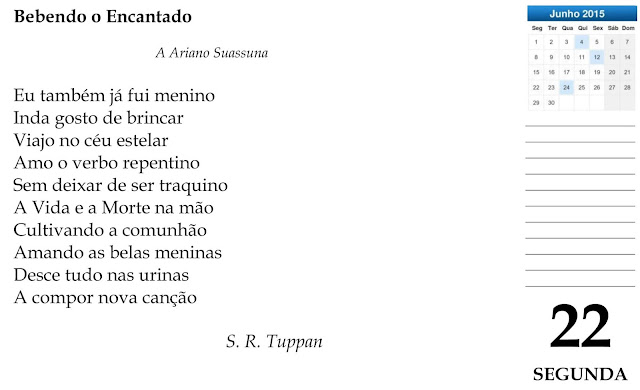 Quem não quer encher a pança / Com os versos de cada dia? / Quem não quer essa alegria? / Quem não quer uma lambança / De boniteza e esperança? / Quem não quer ver a aliança / Do hoje adulto com a criança / Do agora com a fantasia? / Quem não quer mais utopia? / Quem não quer a Poemança? //////////////////////////////////////////////////////////////////////////////////////////////////////////////////////////Folhinha de 2025 (Poetas de Barranco) Em preparação 2029 (Tema "Árvore") e 2030