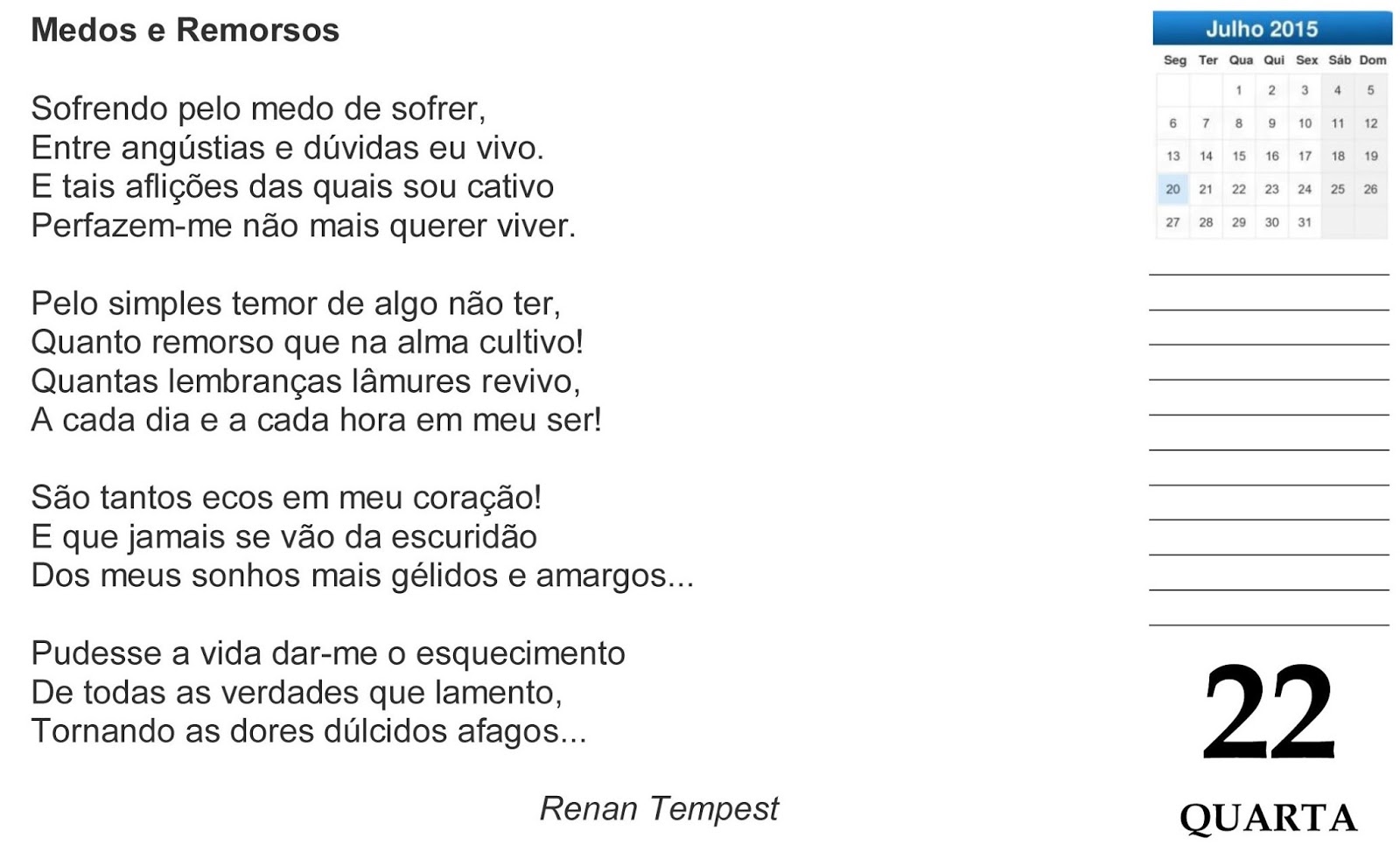 Quem não quer encher a pança / Com os versos de cada dia? / Quem não quer essa alegria? / Quem não quer uma lambança / De boniteza e esperança? / Quem não quer ver a aliança / Do hoje adulto com a criança / Do agora com a fantasia? / Quem não quer mais utopia? / Quem não quer a Poemança? //////////////////////////////////////////////////////////////////////////////////////////////////////////////////////////Folhinha de 2025 (Poetas de Barranco) Em preparação 2029 (Tema "Árvore") e 2030