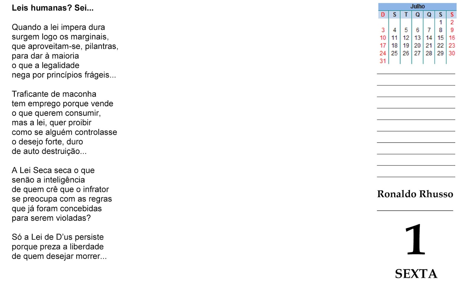 Quem não quer encher a pança / Com os versos de cada dia? / Quem não quer essa alegria? / Quem não quer uma lambança / De boniteza e esperança? / Quem não quer ver a aliança / Do hoje adulto com a criança / Do agora com a fantasia? / Quem não quer mais utopia? / Quem não quer a Poemança? //////////////////////////////////////////////////////////////////////////////////////////////////////////////////////////Folhinha de 2025 (Poetas de Barranco) Em preparação 2029 (Tema "Árvore") e 2030